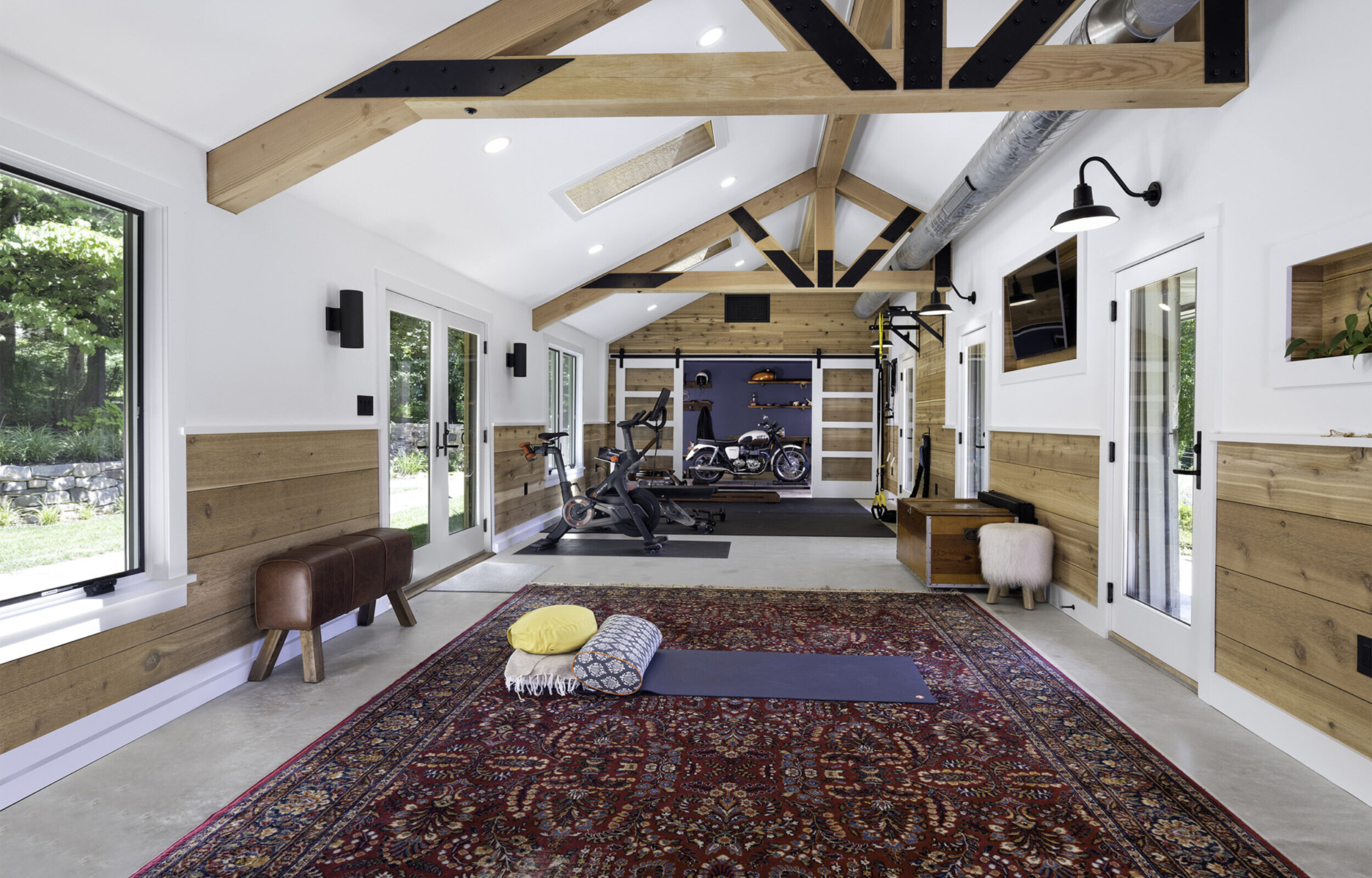 We transformed this former horse stable on a residential property into a yoga and fitness studio, complete with a garage space for a motorcycle.
